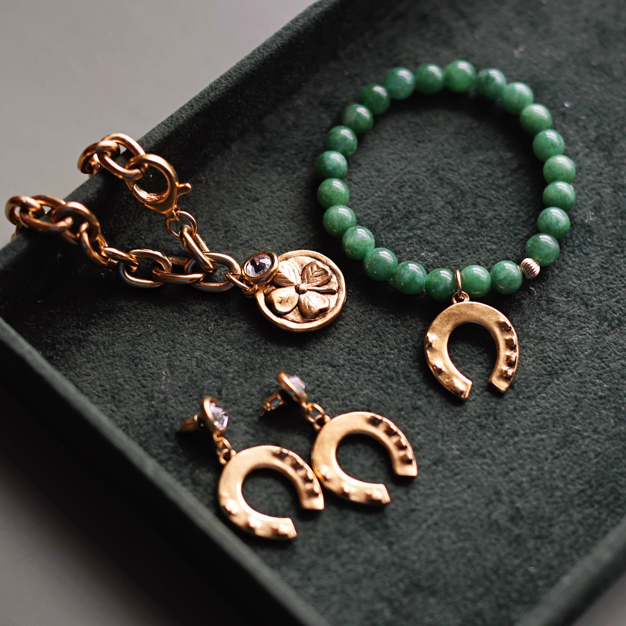 Moxi is your pop-of-color piece with a little intention behind it. Designed with smooth jade beads, available as a stand alone or finished with your choice of a shamrock or horseshoe charm. This bracelet brings personality to your stack without feeling themed, trendy, or overdone. A small symbol you carry with you, whether you believe in luck, need a reminder of something good, or just love a piece that feels personal.