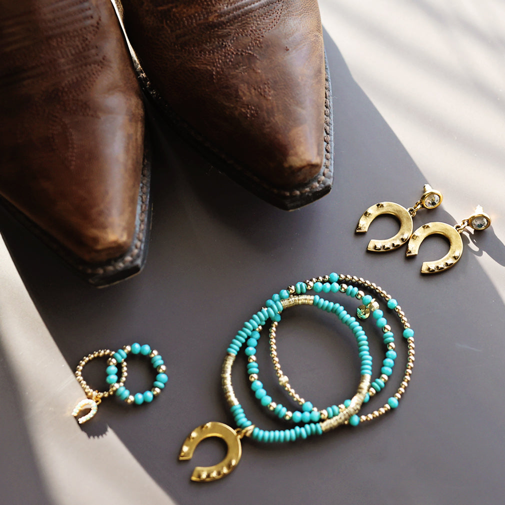 The Sawyer Bracelet captures the laid back spirit of the season with a touch of western charm. Designed with assorted turquoise glass beads in a mix of shapes and sizes, this bracelet offers rich color variation and subtle texture, creating the perfect balance between earthy and refined.