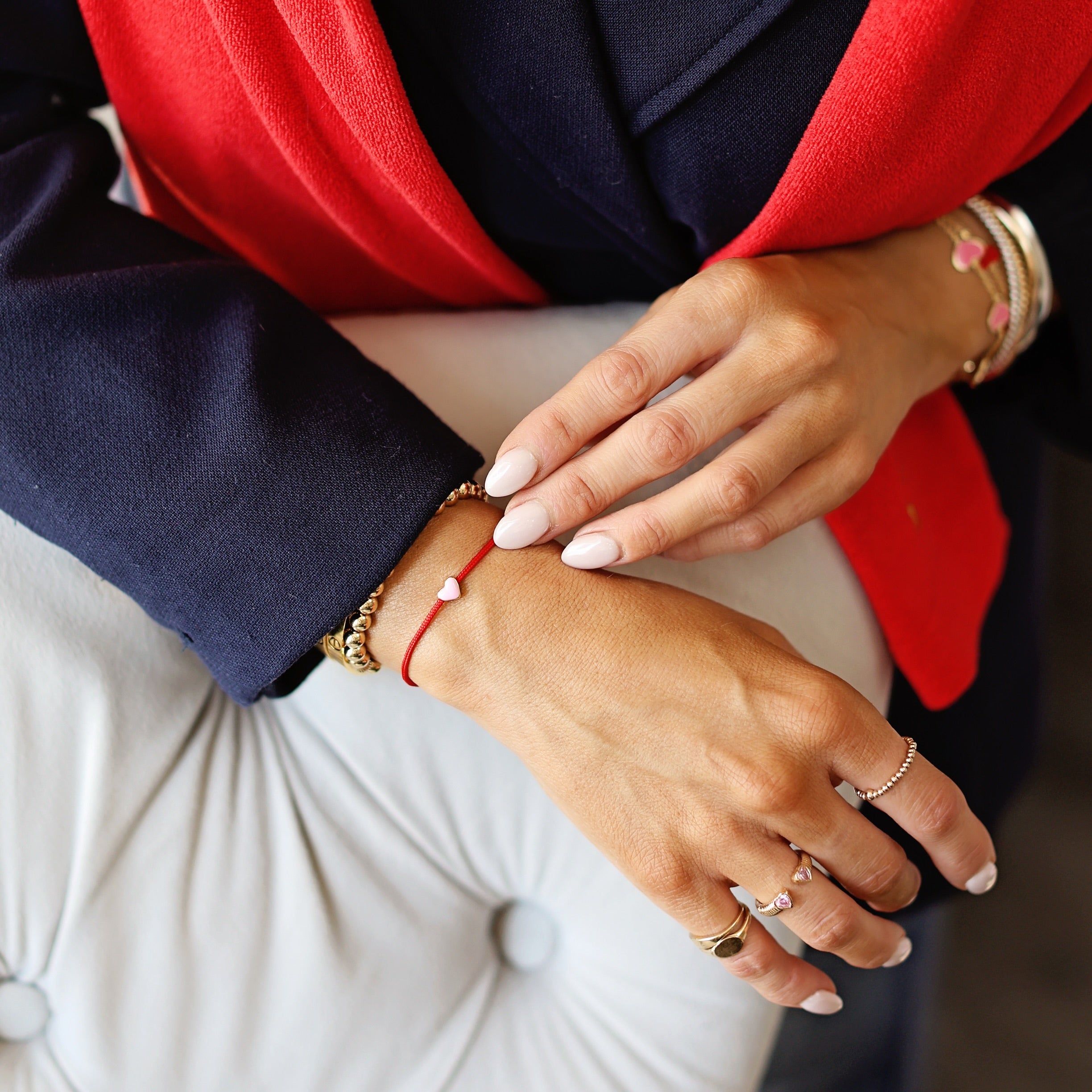 Our newest Valentine’s bracelet features a bold red cord finished with a tiny pink enamel heart. A red cord bracelet symbolizes love, protection, strength, and intention, often worn as a meaningful reminder of connection, luck, and everyday positivity. Simple, sweet, and full of meaning. Designed with a sliding cord adjuster, it comfortably fits wrist sizes 6–8 inches, making it both trendy and size-inclusive. The perfect piece to gift or keep.