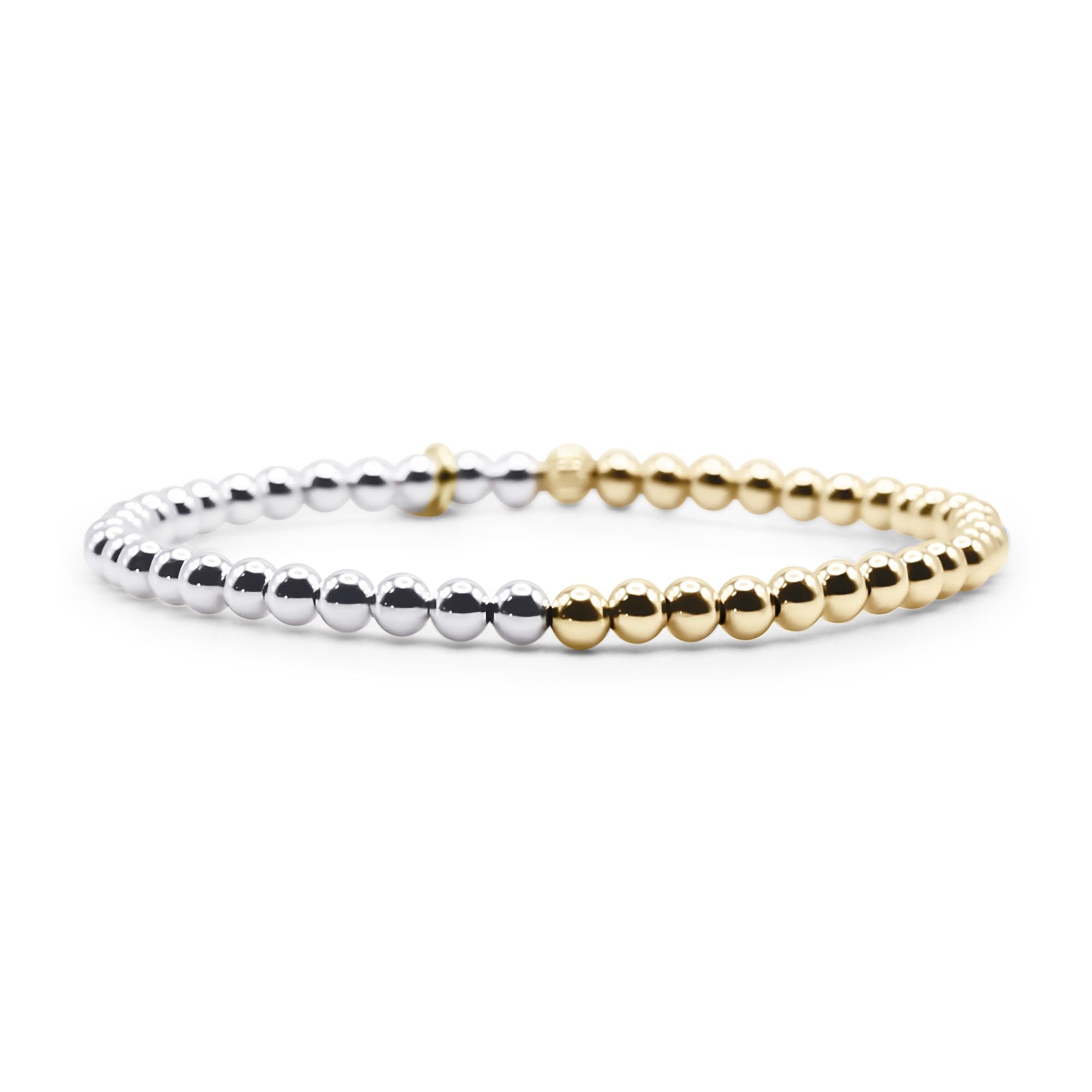 Our two-tone stretch bracelet brings together 4mm 14k gold-filled and .925 sterling silver beads in a classic mix of gold and silver. It’s perfect for those who love both metals and want a piece that goes with everything. Easy to slip on, this bracelet is ideal for stacking or wearing solo when you want just a hint of shine. Whether you lean toward gold or silver, this bracelet bridges both worlds effortlessly—making it a natural fit for any style.