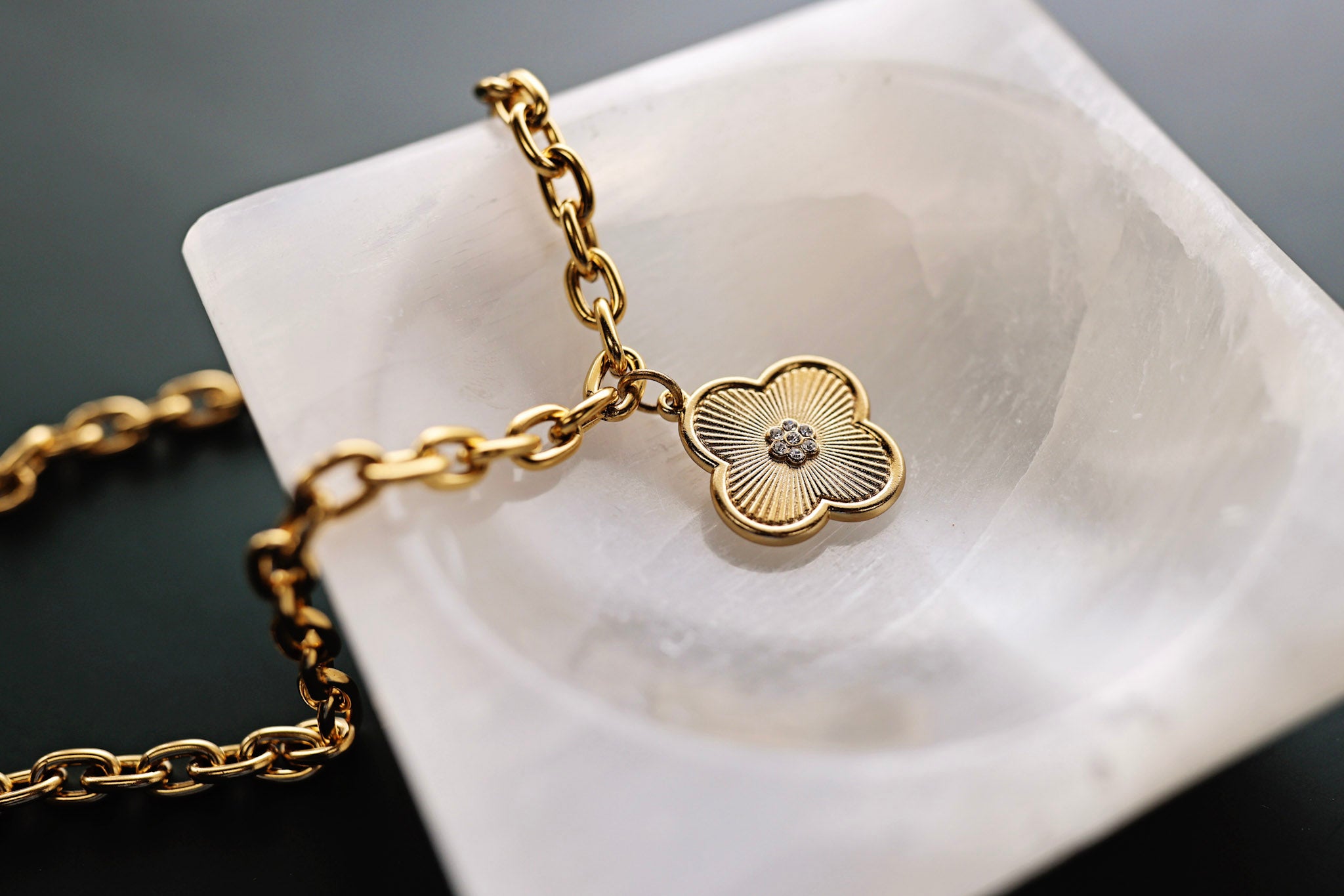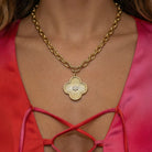 Introducing the Arden Lane Necklace, a bold new chapter in our bestselling Arden Collection. This luxe design features our custom 25mm Arden Lane clover charm, finished with textured detailing and a sparkling micro pavé CZ center. Suspended from our gold plated oval chain, the Arden Lane Necklace is designed for layering or wearing solo as a signature piece.