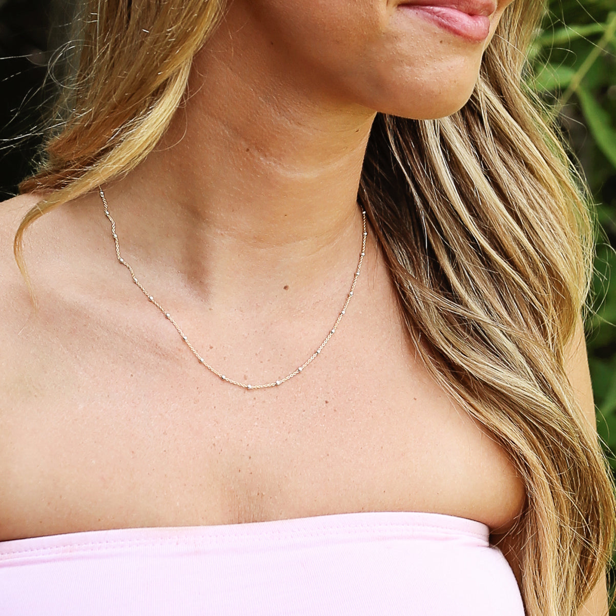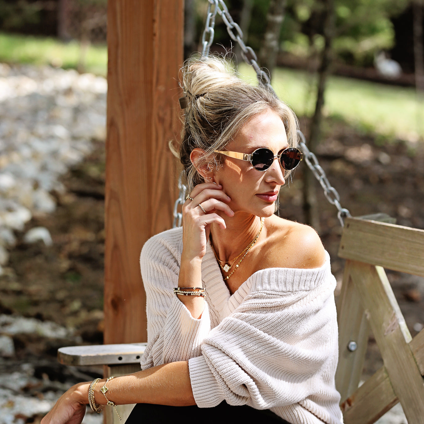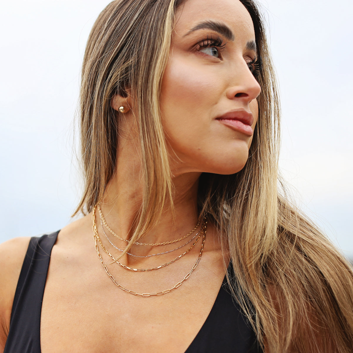 All of our chains are 14k gold-filled or sterling silver and will not tarnish. SWIM. SHOWER. SUN. They're effortless jewelry pieces designed to be lived in.