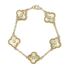 Elevate your style with this elegant bracelet, featuring a dainty 14k gold chain that embodies understated luxury. Stationed throughout is 14mm gold clover connectors that radiate, adding a touch of timeless sophistication. Designed for versatility, this piece is perfect for both everyday wear and special occasions, complementing any outfit with subtle grace. A classic blend of elegance and simplicity, it’s a must-have addition to any jewelry collection.