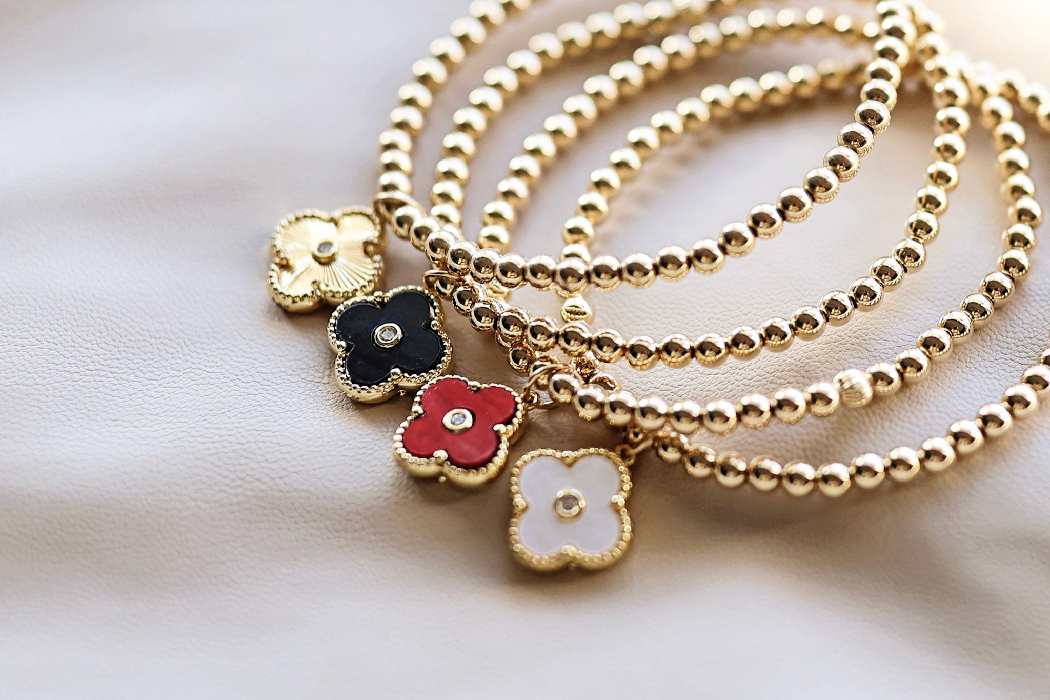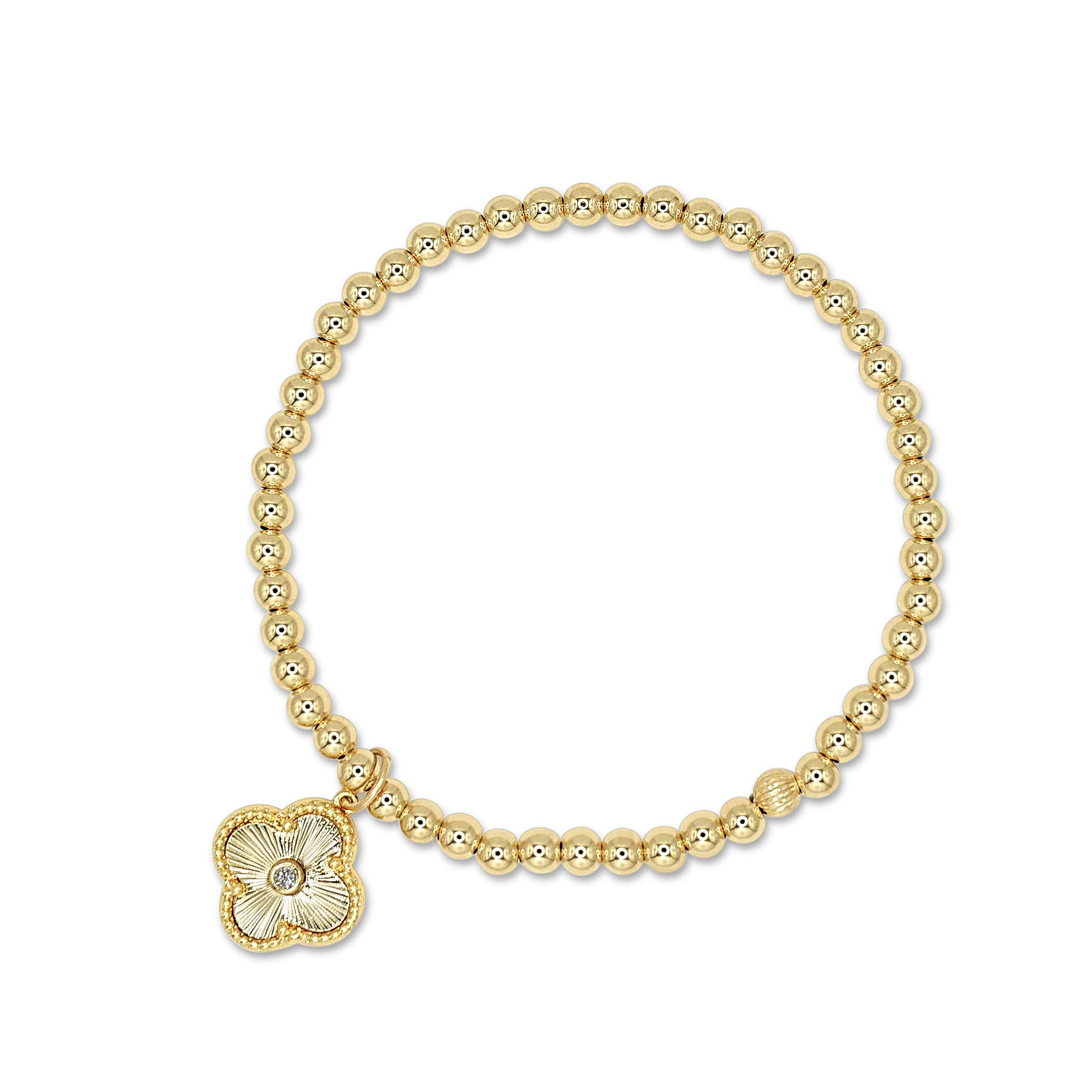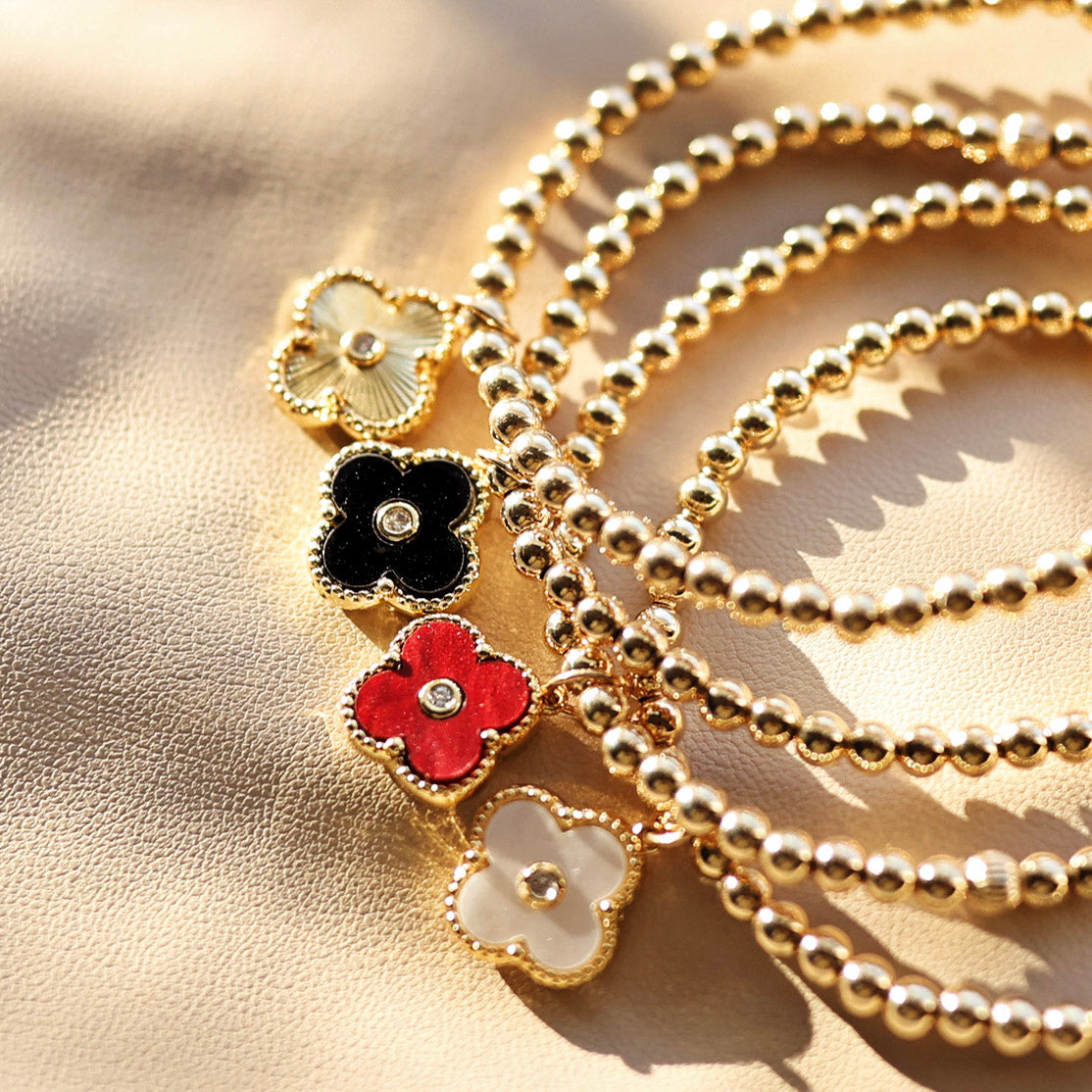 The Arden Charm Bracelet features our classic 4mm gold filled stretch bracelet, upgraded with a 14mm gold Arden Clover charm for a monochrome, luxe finish. It’s lightweight, timeless, and perfect for stacking with other Arden pieces or wearing alone as your everyday bracelet.