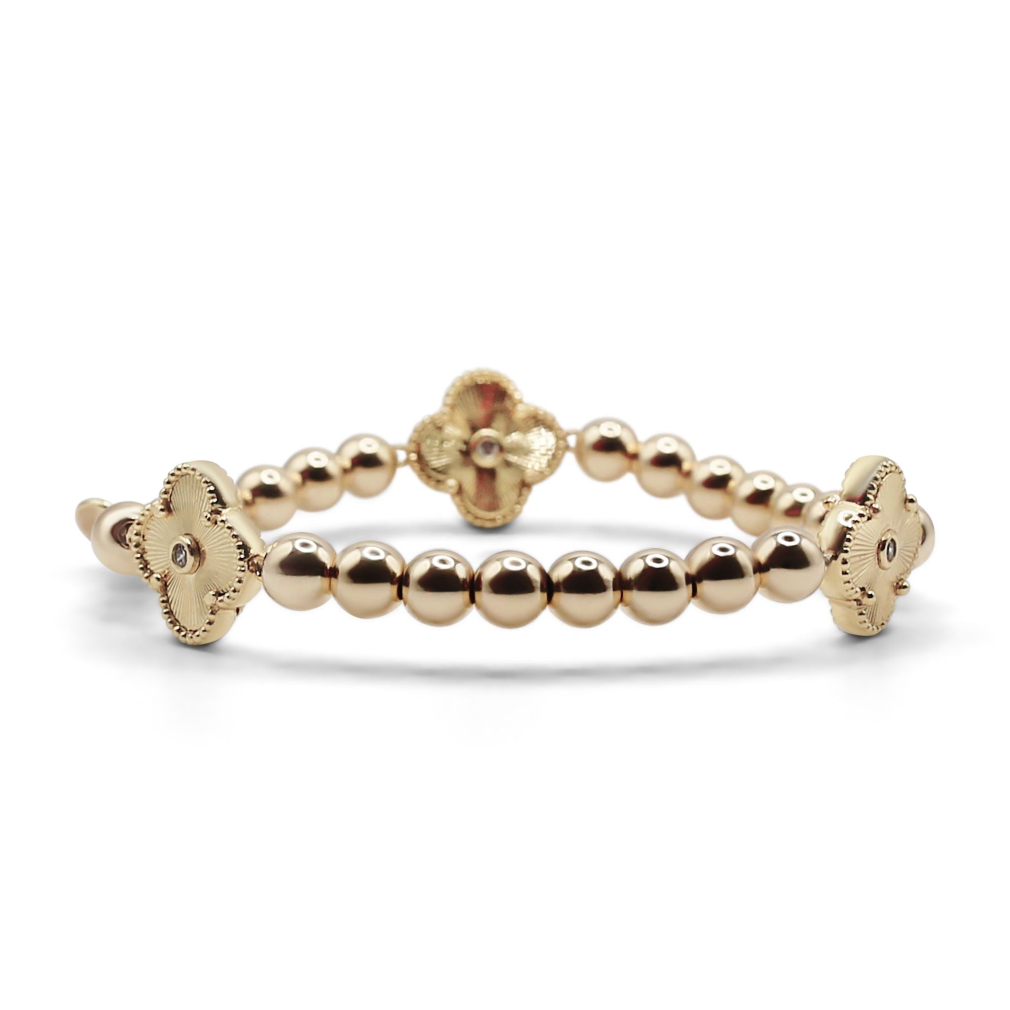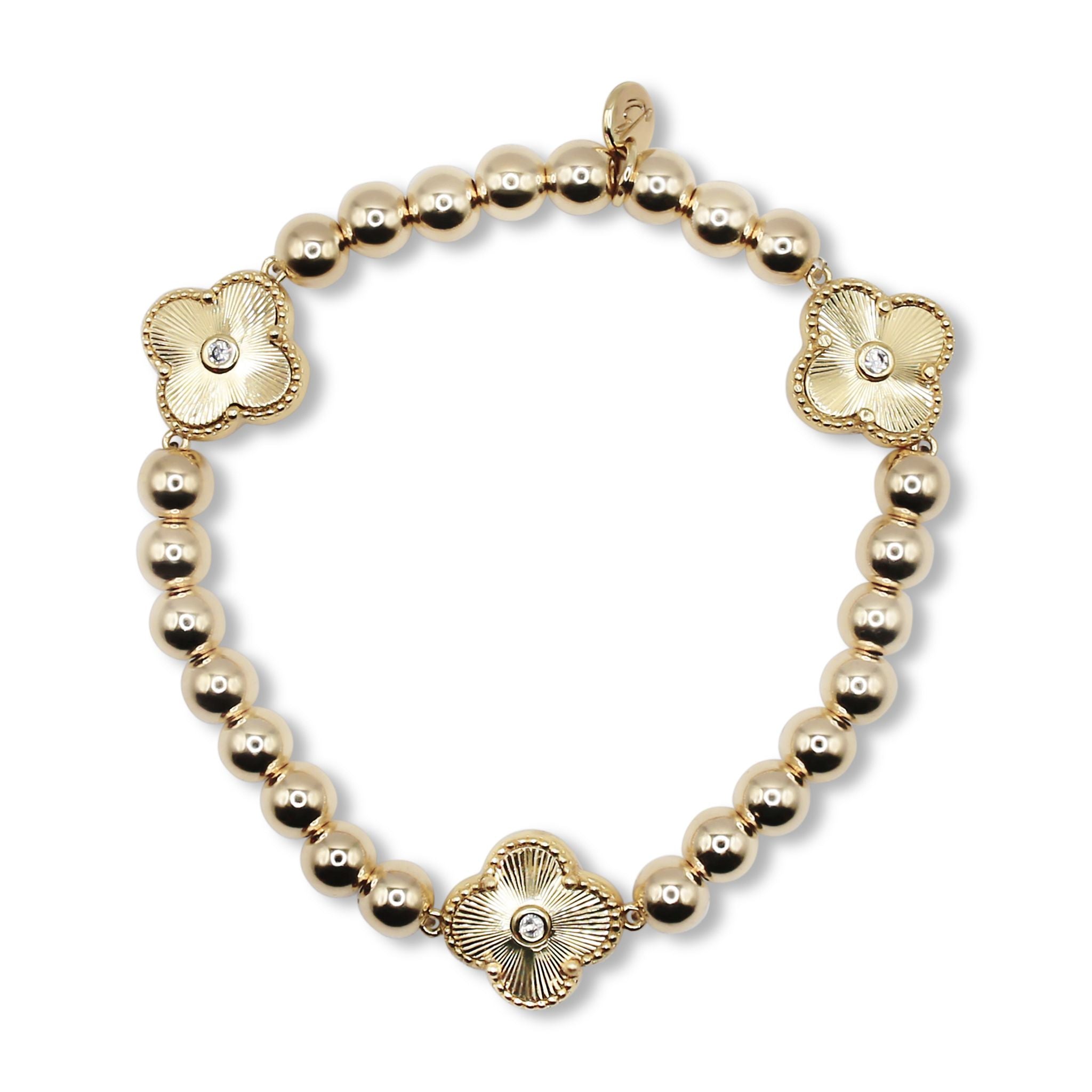 Enhance your accessory collection with this elegant, stretchy Arden bracelet. Crafted with 6mm gold-filled beads, this bracelet radiates sophistication while remaining easy to wear. The design features three 14mm clover connectors stationed throughout, adding a charming touch.