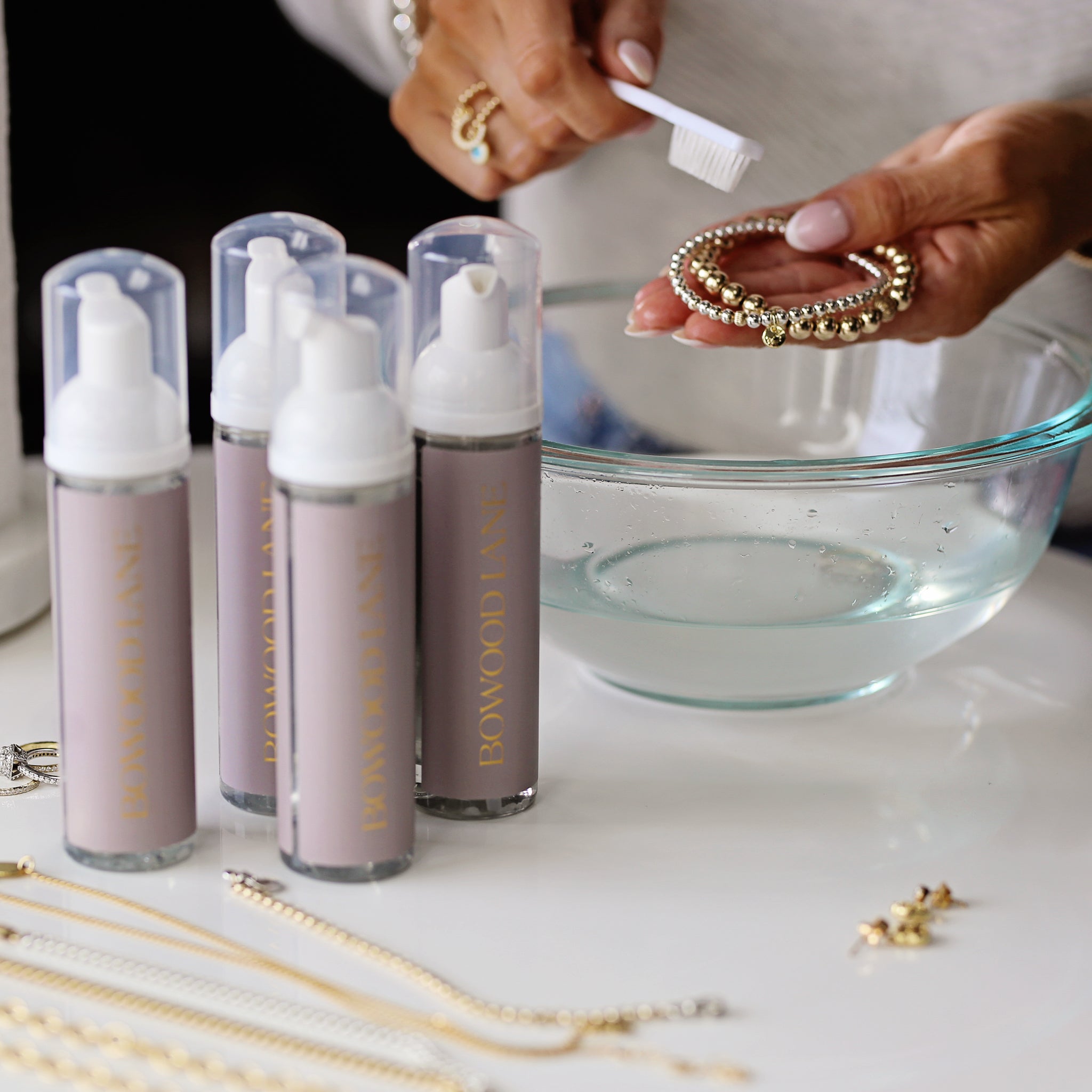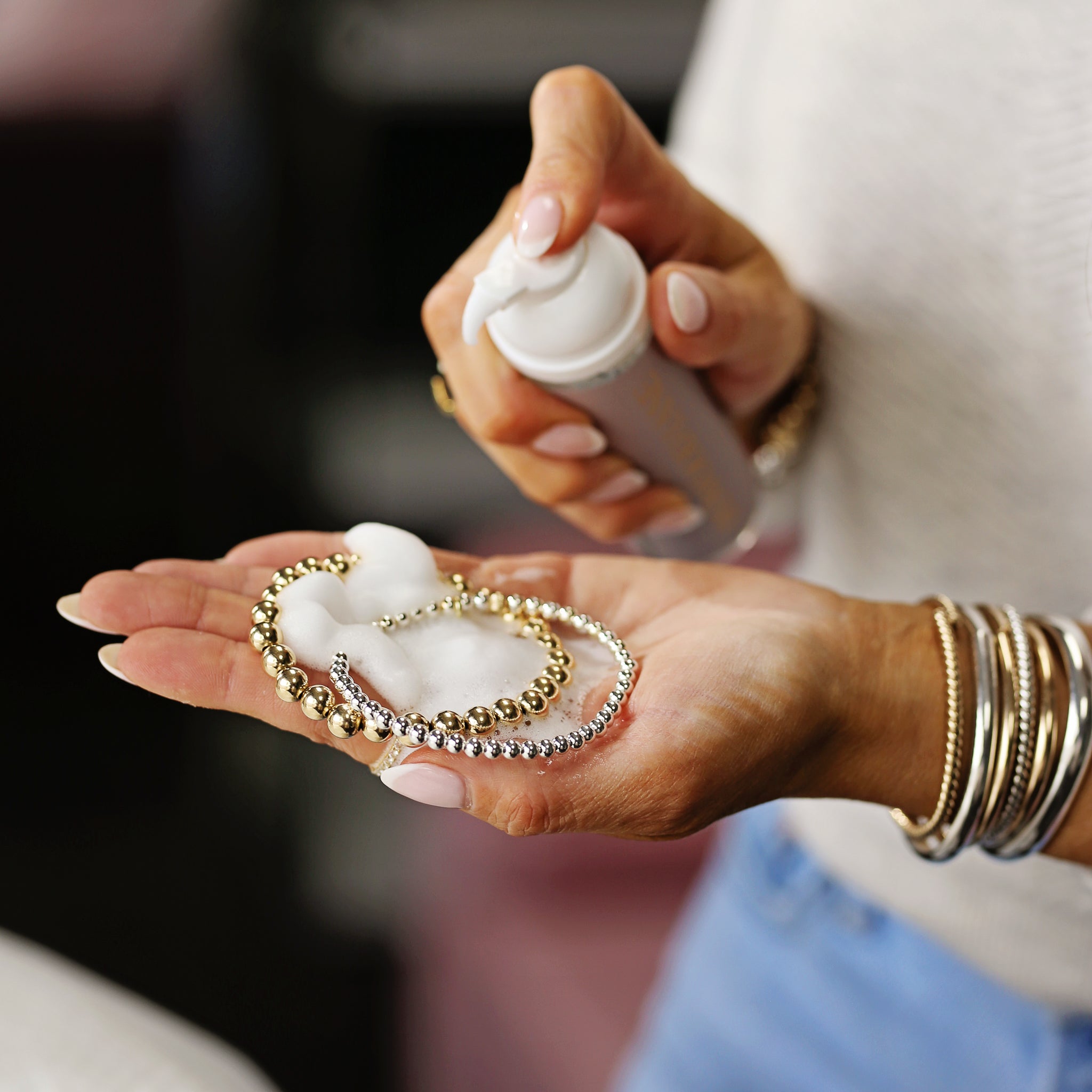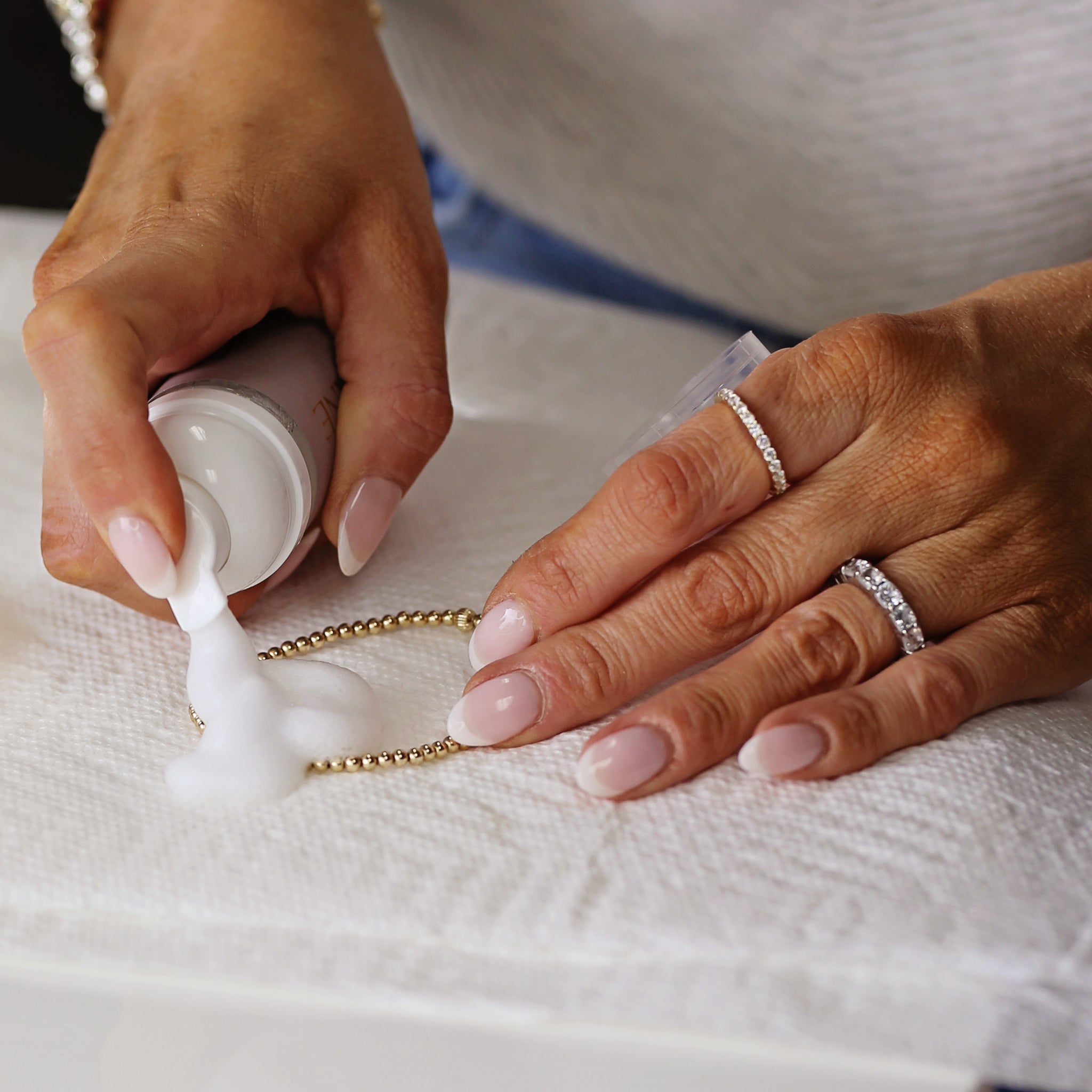 Our Bowood Lane Foaming Jewelry Cleaner is specially formulated to bring back the brilliance of your favorite pieces. Designed for gentle yet effective cleaning, this foaming formula is perfect for 14k gold-filled, sterling silver, diamonds and gemstones —keeping your jewelry looking radiant every day.