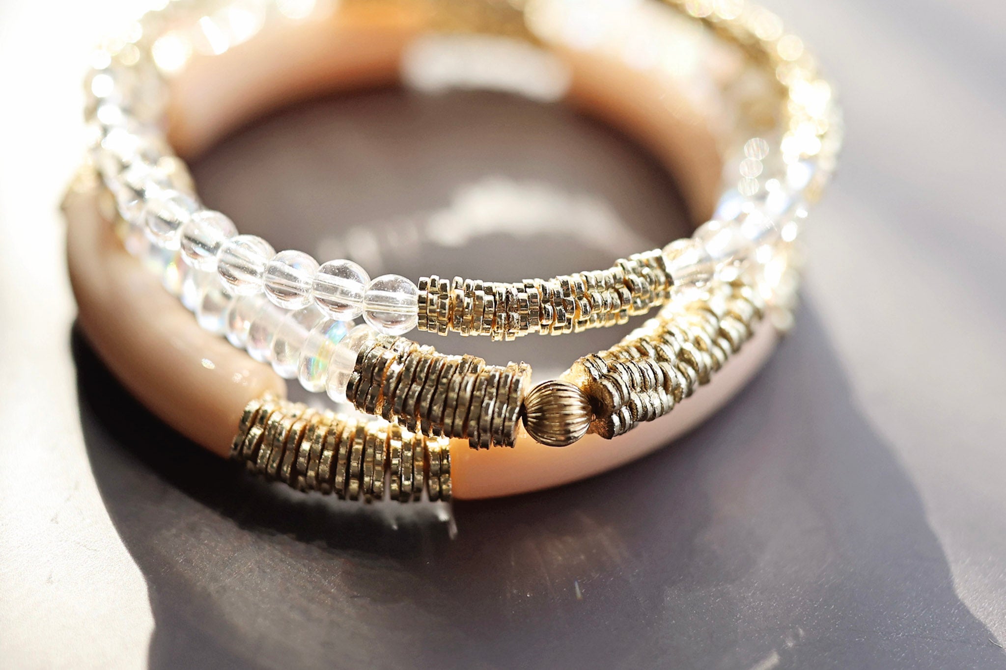 Our bestselling Clearwater Beach Stack returns, refreshed in timeless neutrals. This three piece bracelet stack combines textured finishes and varying sizes to create effortless dimension. Designed for versatility, each bracelet can be worn solo for a minimal look or layered together for a statement stack.