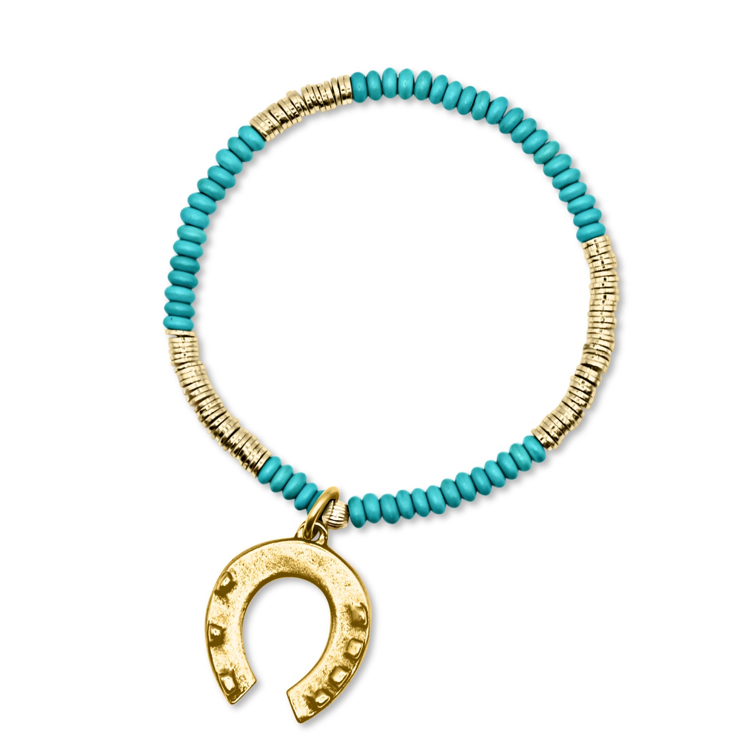 Introducing the Colt Bracelet, where western influence meets modern luxury. Designed with 4mm turquoise rondelle beads and accented with gold-plated discs, this bracelet delivers effortless color and texture with every wear. Featuring our bold horseshoe charm, adding a touch of statement style, symbolic of luck and strength.