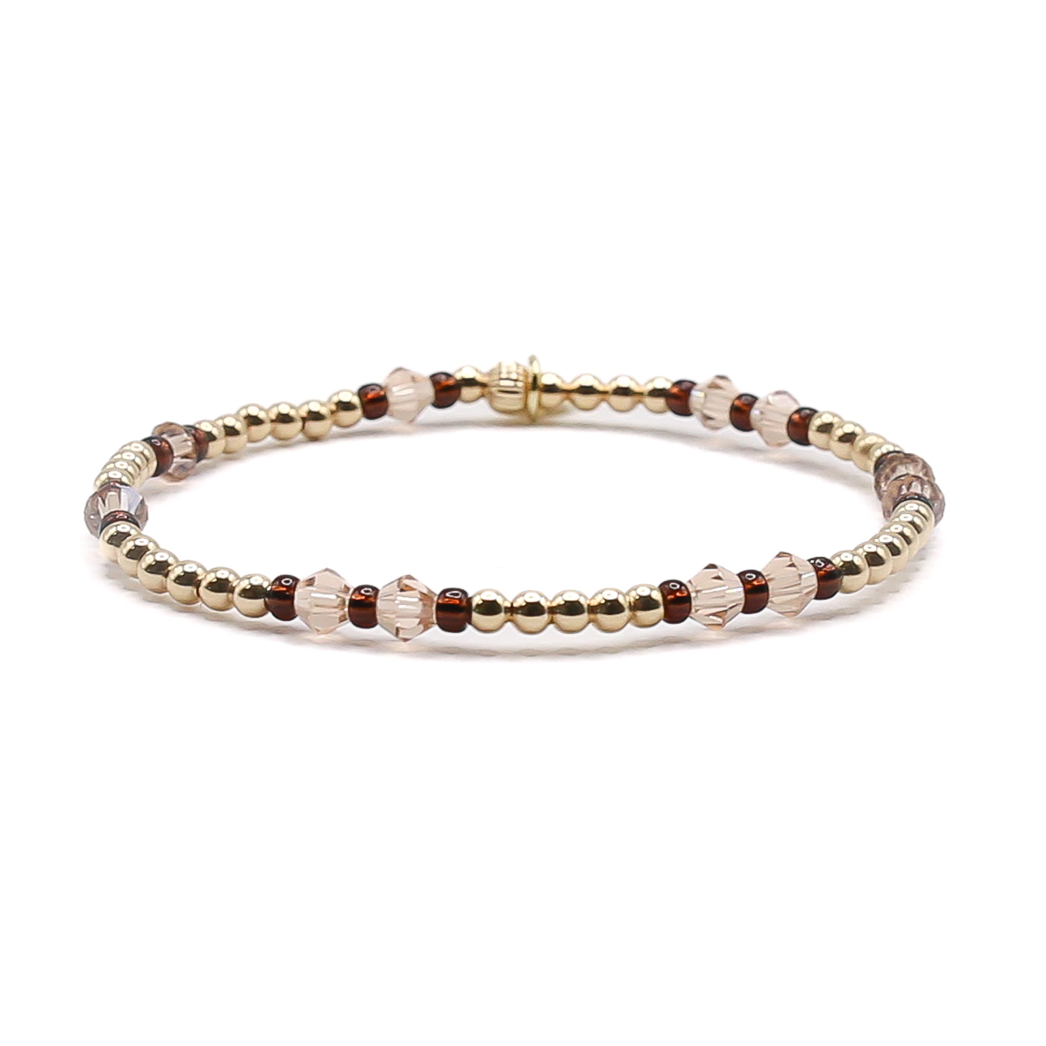 This beautiful piece features 3mm 14k gold-filled beads in warm, natural tones, complemented by sparkling crystal beads and delicate seed beads. the combination creates a harmonious blend of textures and colors, perfect for adding a subtle yet stylish flair to any outfit. lightweight and comfortable, this bracelet is ideal for stacking or wearing on its own. elevate your everyday look with this versatile accessory!