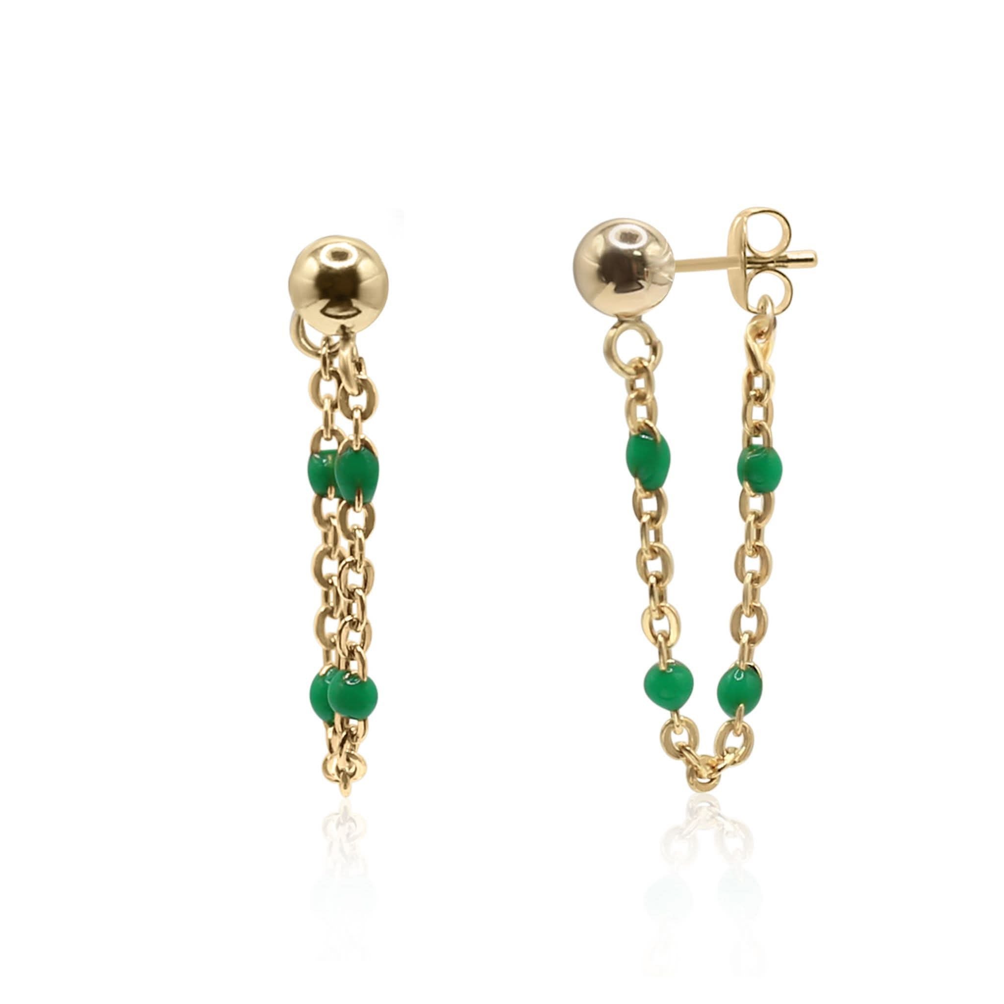 A subtle touch of green with just the right amount of shine. These Enamel Hoop Chain Earrings feature delicate gold-filled hoops with a sleek green enamel finish, accented by a dainty chain detail for effortless movement and elegance. Lightweight, versatile, and perfect for stacking or wearing solo, adding a pop of color to any look.