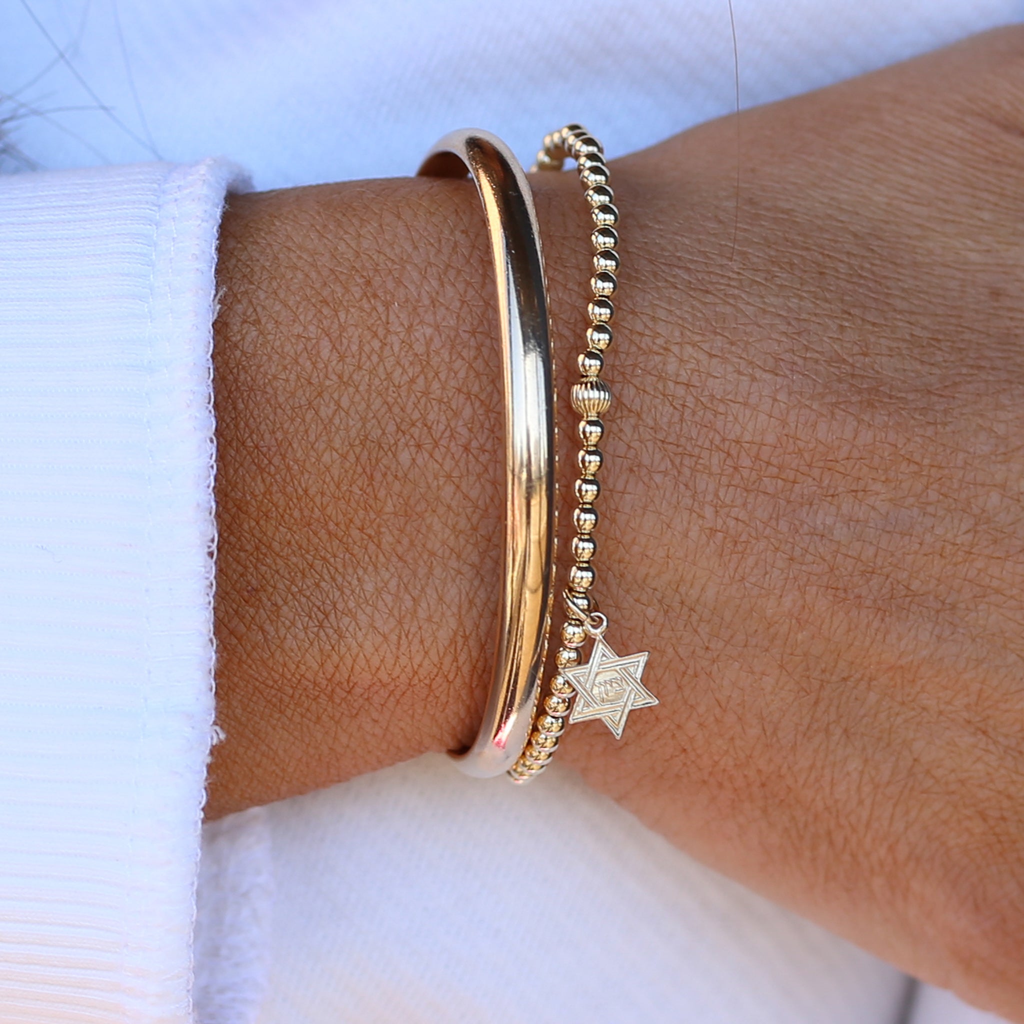 The 3mm 14k Gold-Filled Star of David Charm Bracelet from our Faith Collection is a beautifully crafted piece that symbolizes faith, spirituality, and unity. Designed with a delicate 3mm width, this bracelet is available in sizes for kids, teens, and adults, making it perfect for wearers of all ages. Featuring a Star of David charm, it’s a meaningful accessory for those who embrace faith and tradition. The stretch design ensures an easy-on, easy-off fit, offering comfort and practicality for daily wear. Whether worn alone or layered with other pieces, this bracelet is a timeless addition to any jewelry collection.