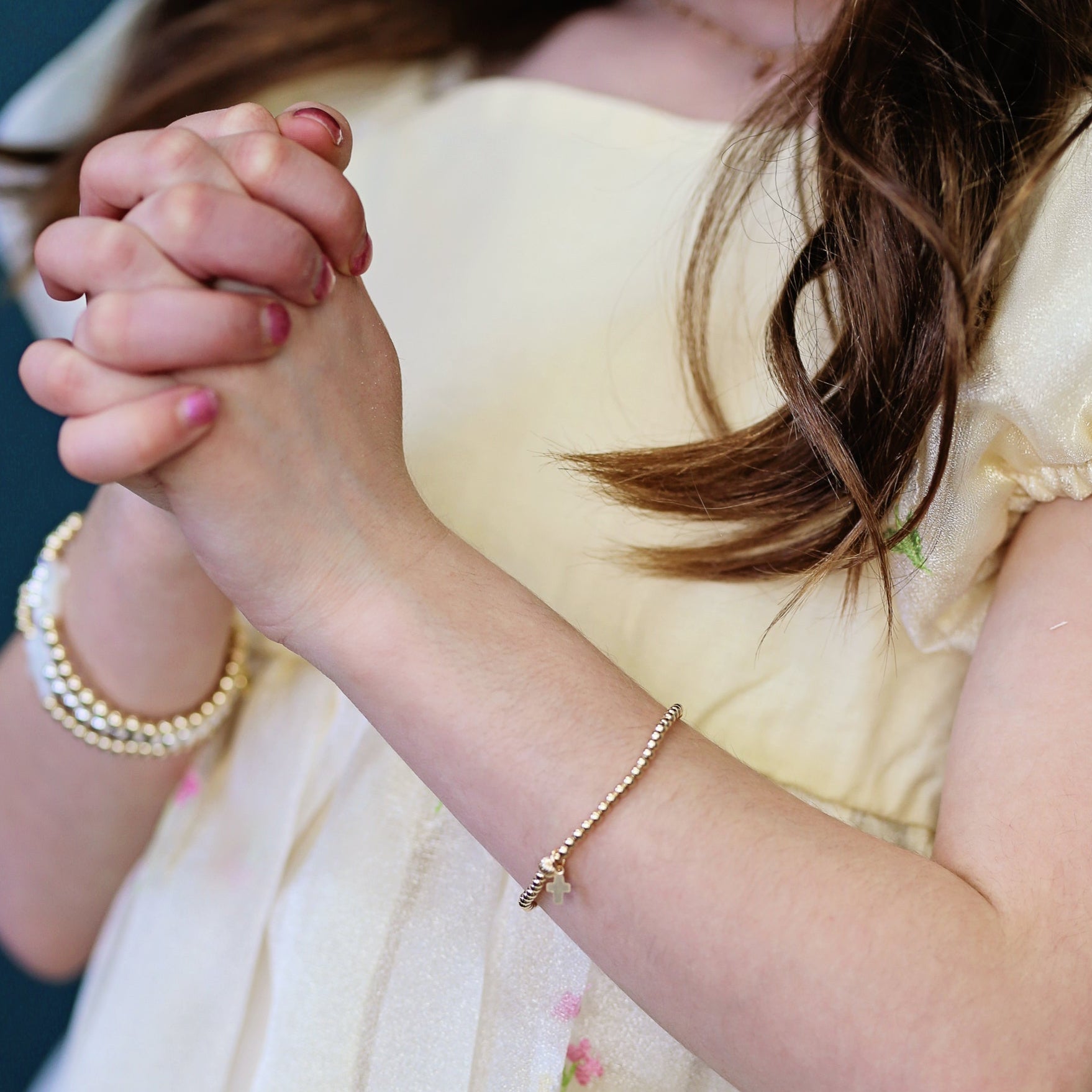 Introducing the 2.5mm 14k Gold-Filled Mini Cross Charm Bracelet from our Faith Collection, designed especially for kids. This delicate and beautiful bracelet features a tiny, yet meaningful, cross charm, crafted in high-quality 14k gold-filled material. The 2.5mm width offers a dainty and comfortable fit, perfect for young wearers. The stretch design ensures it’s easy to slip on and off, making it a practical and stylish choice for daily wear. Whether worn alone or paired with other accessories, this bracelet is a wonderful symbol of faith for your little one.