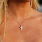 Introducing the Hope Necklace. Add a touch of faith and elegance to your jewelry collection with our 14k gold filled cubic zirconia cross necklace. This beautiful piece features a delicate cross charm hanging from a 14k gold-filled chain, creating a stunning yet understated look.