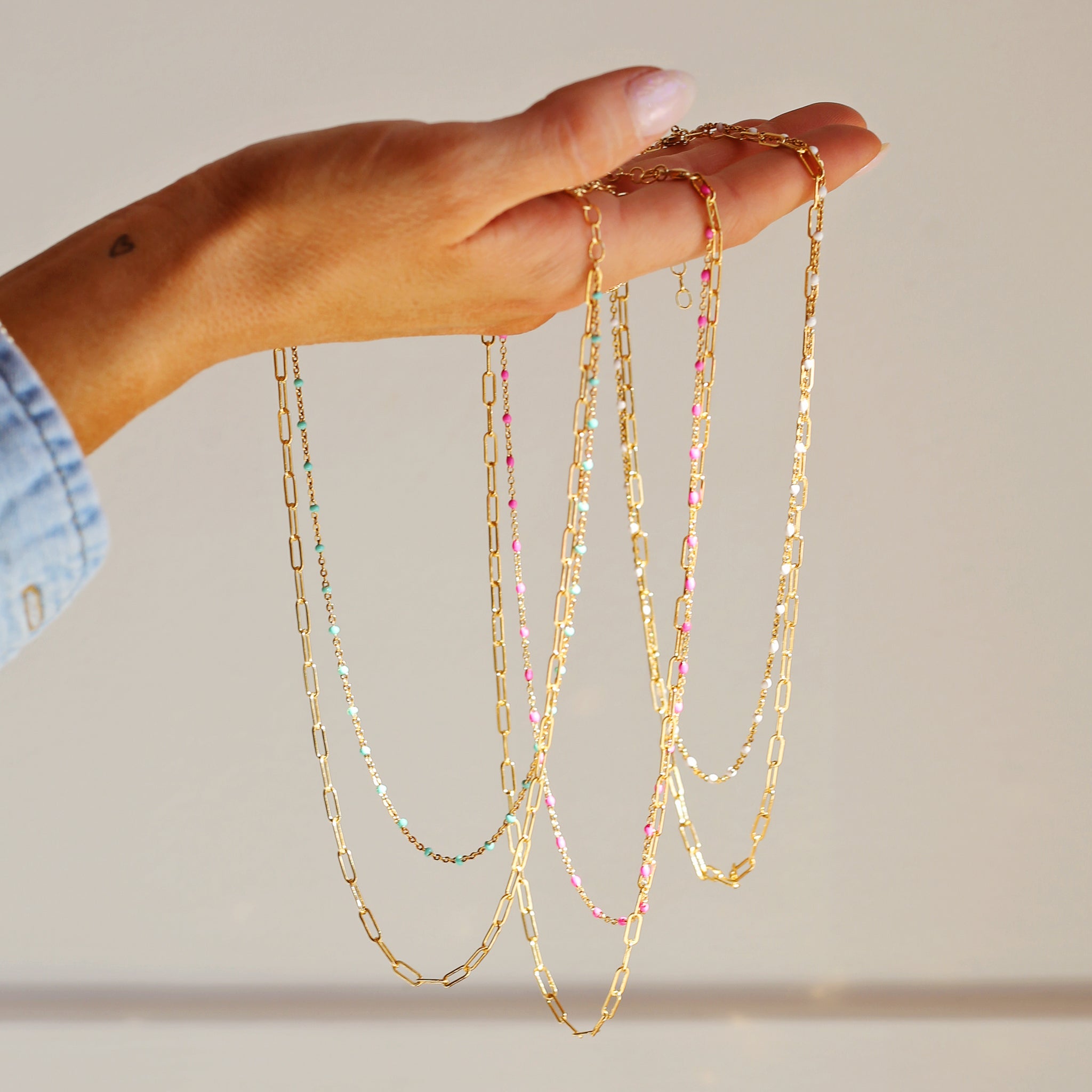 The Lennox Necklace Stack combines the best of both worlds — a vibrant, gold-filled enamel color chain paired with our bold Brooklyn 14k Gold Filled Paperclip Chain. This perfect layered duo brings together the energy of color with the timeless elegance of gold, creating a versatile, eye-catching look. Whether you’re hitting the beach, lounging by the pool, or enjoying a vacation, these waterproof necklaces are built to withstand it all. Wear them together or separately for a style that’s always ready to shine. Two necklaces, endless possibilities